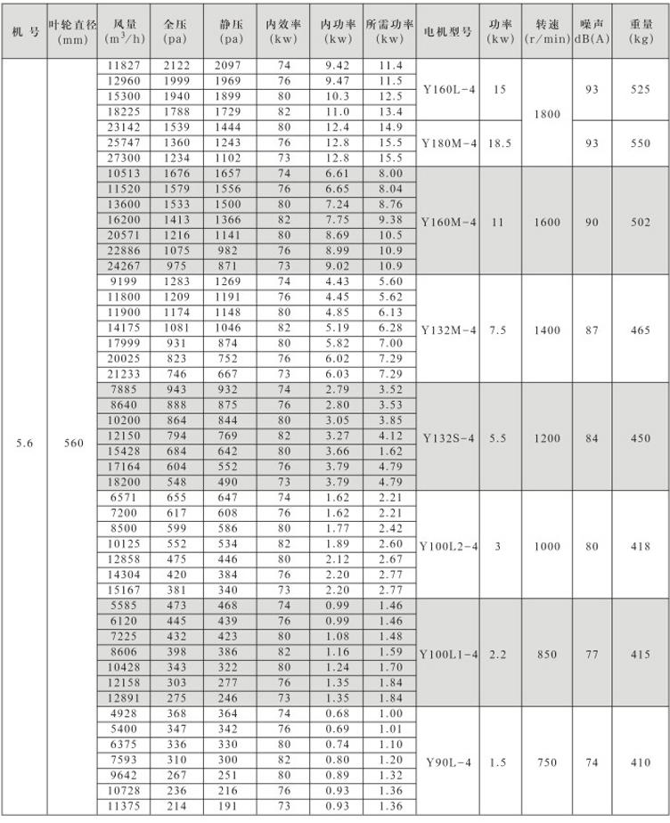 風機葉輪、機殼為優質鋼板,全部模具生產,采用焊接成形,葉輪經靜、動平衡校正,其平衡精度不大于5.6級。
